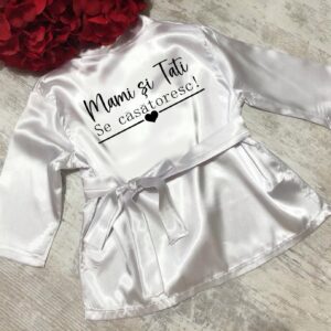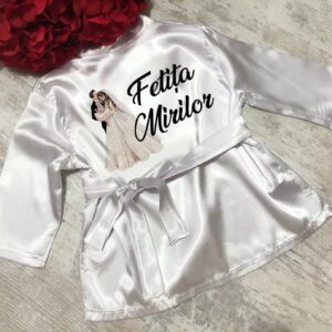 Halat de Mire Personalizat Universal 2024415. Halat din Satin premium pentru Mire personalizat prin termotransfer . Se poate executa si in culori Alb, Negru si Bleomaren. Lungimea este de 80 cm de la umar pana jos. Pretul afisat este doar pentru halat. Halatul face parte din categoriaHalate.