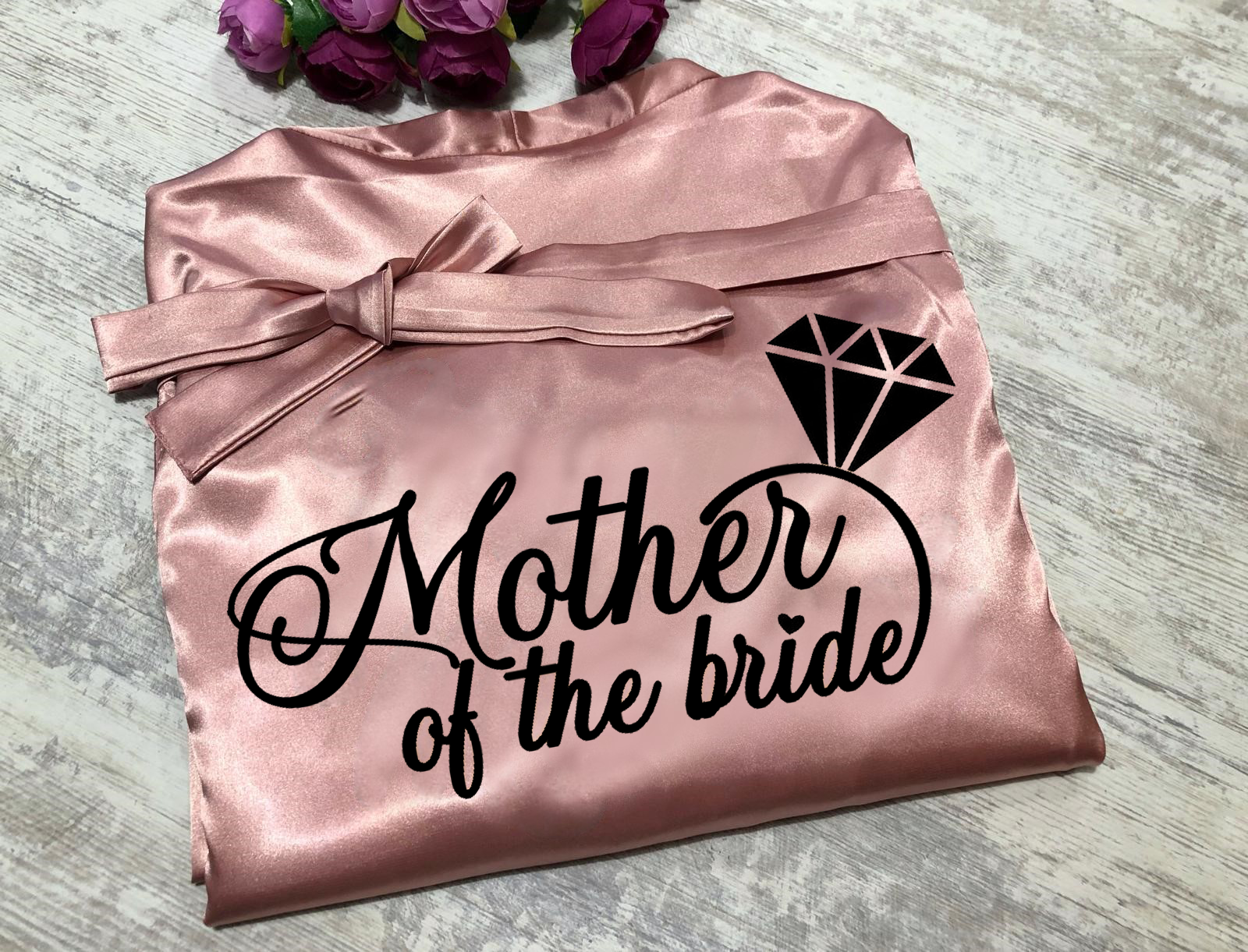 Halat din Satin Premium – Mama Miresei 202525, personalizat prin termotransfer, perfect pentru mama miresei. Disponibil într-o gamă variată de culori: albastru, roz, verde, bordo, mov, lila, roșu, roz prăfuit, albastru regal, personalizat doar cu text negru la halatele colorate, textul halatelor albe se poate personaliza cu orice culoare.