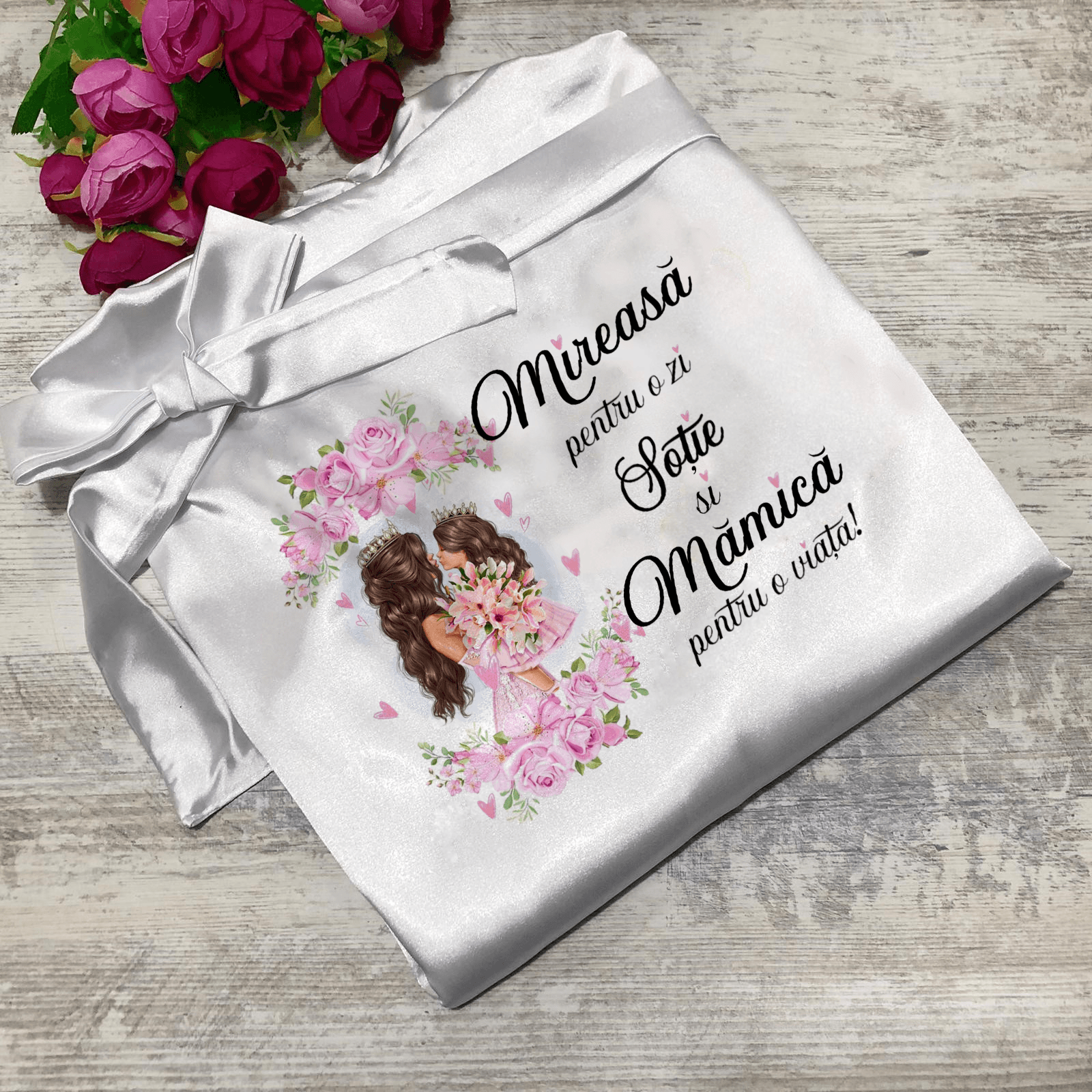 Halat Mireasa Personalizat Alb Universal 2024246. Halat mireasa personalizat prin termotransfer. Lungimea este de 80 cm de la umar pana jos. Pretul afisat este doar pentru halat. Halatul face parte din categoria Halate.