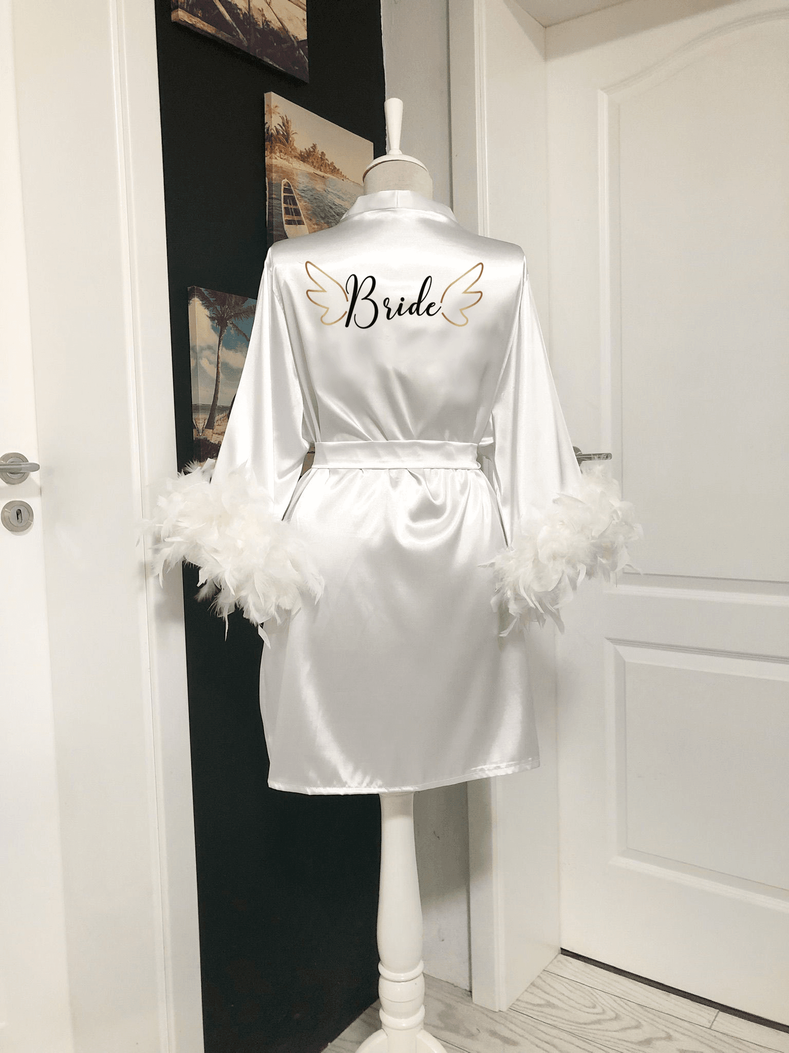 Halat Mireasa Personalizat Alb Universal cu Pene 2024126. Halat mireasa personalizat prin termotransfer. Lungimea este de 80 cm de la umar pana jos. Pretul afisat este doar pentru halat. Halatul face parte din categoria Halate.