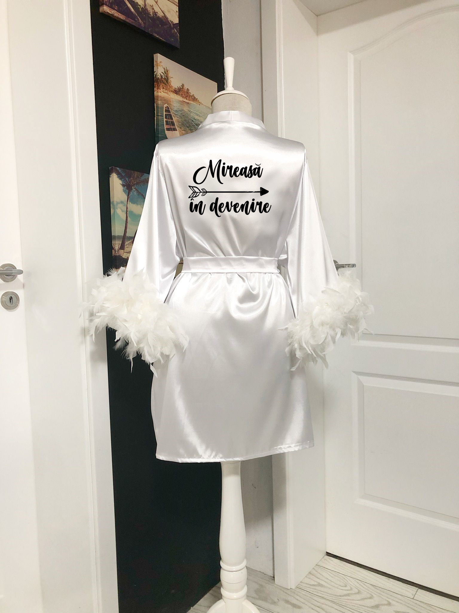 Halat Mireasa Personalizat Alb Universal cu Pene 2024254. Halat mireasa personalizat prin termotransfer. Lungimea este de 80 cm de la umar pana jos. Pretul afisat este doar pentru halat. Halatul face parte din categoria Halate.