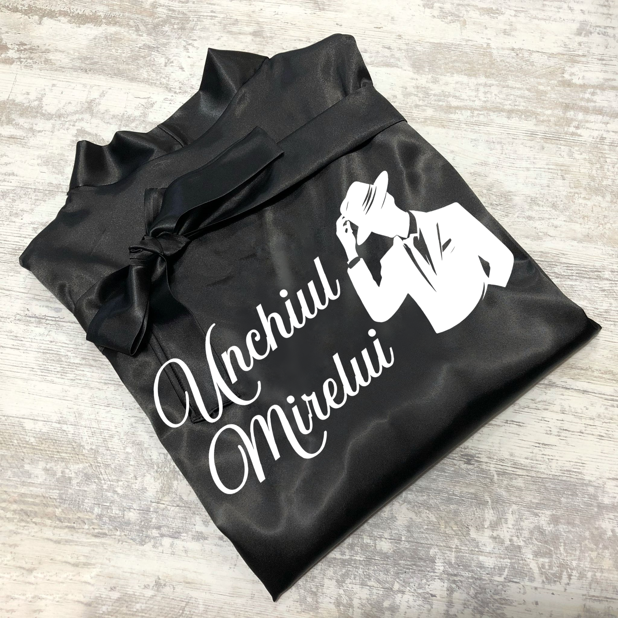 Halat din Satin premium pentru unchiul mirelui personalizat prin termotransfer . Se poate executa si in culori Alb, Negru, Bleomaren, etc. Lungimea este de 80 cm de la umăr pana jos.