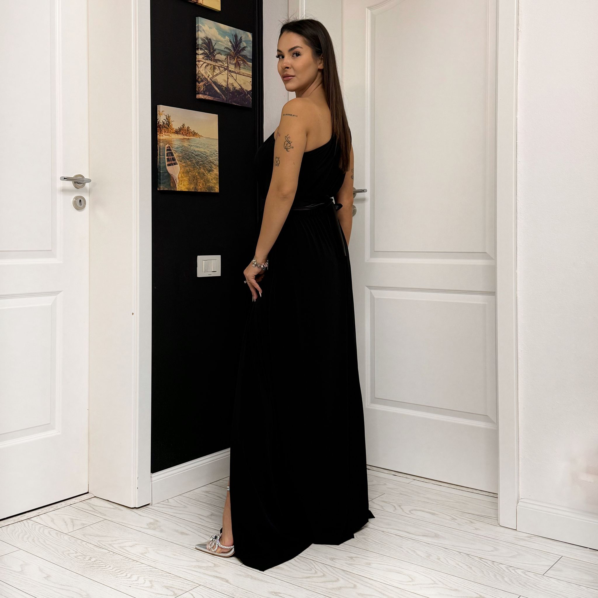 Rochie domnisoara de onoare pe o parte – crepeu petrecut – Lycra 20259, lunga din material de Lycra. Se poate executa si in culori albastru, roz, verde, bordo, mov, lila,rosu,roz prafuit, albastru regal etc. Lungimea rochiei din talie este de 110 cm.