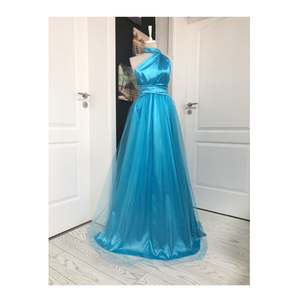 Rochie Versatilă lungă din Satin cu tulle universala RVT001U. Rochie versatila, lunga din material Satin Premium cu tull. Se poate executa si in culori albastru, roz, verde, bordo, mov, lila,rosu,roz prafuit, albastru regal etc. Lungimea fustei din talie este de 110 cm. Rochia face parte din categoria rochii versatile.