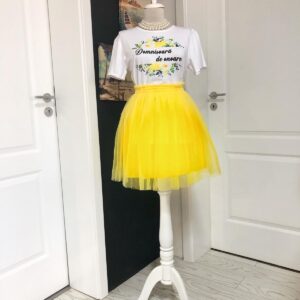 Set fusta plus tricou personalizat 2024229 Fusta din tulle, scurta din material tulle si jupa , culoare verde smarald si tricou personalizat . Se poate executa si in culori albastru, roz, verde, bordo, mov, lila,rosu,roz prafuit, albastru regal etc. Lungimea fustei din talie este de 50 cm. Setul face parte din categoria seturi personalizate domnisoara de onoare.